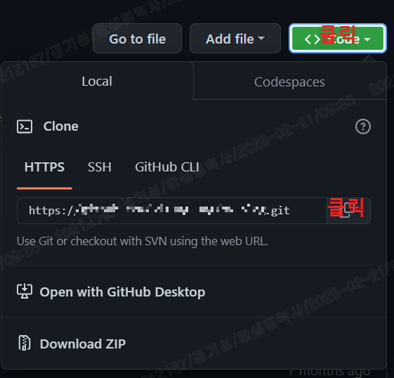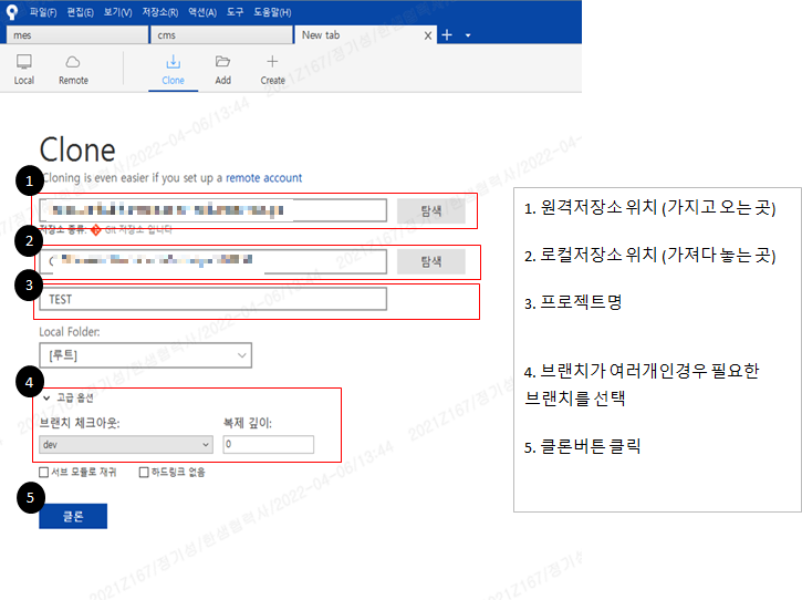 <클론이미지 1>처럼 Remote에서 계정에 연결된 원격레파지토리를 찾아 clone을 누르면 <클론이미지2>로 넘어가서 셋팅된다. <클론이미지2>에 바로 가서 원격저장소 위치를 복사해서 붙여넣어도 된다.