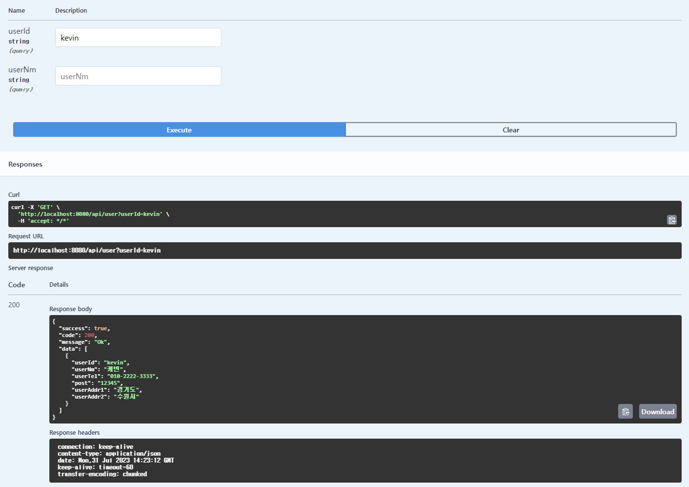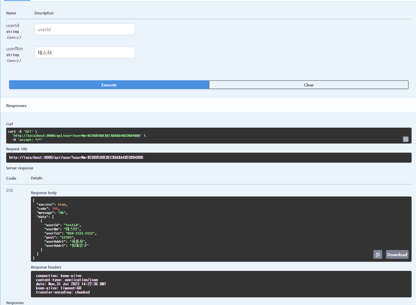 이렇게 구현하였고 Swagger를 통해 통신확인 결과
