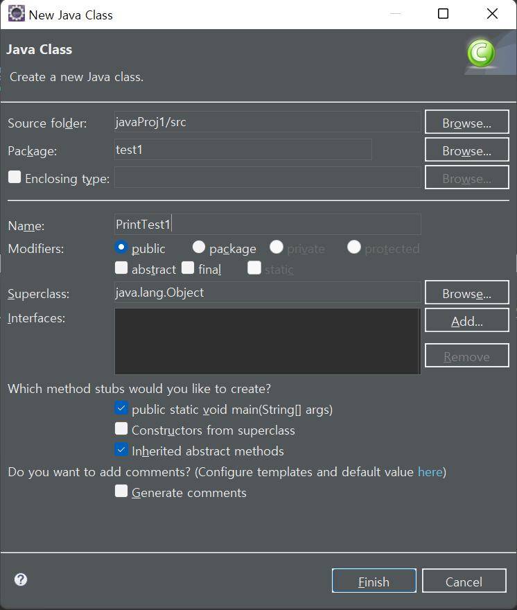 *test1 패키지를 만들고 그 아래 class 파일을 생성하였다.