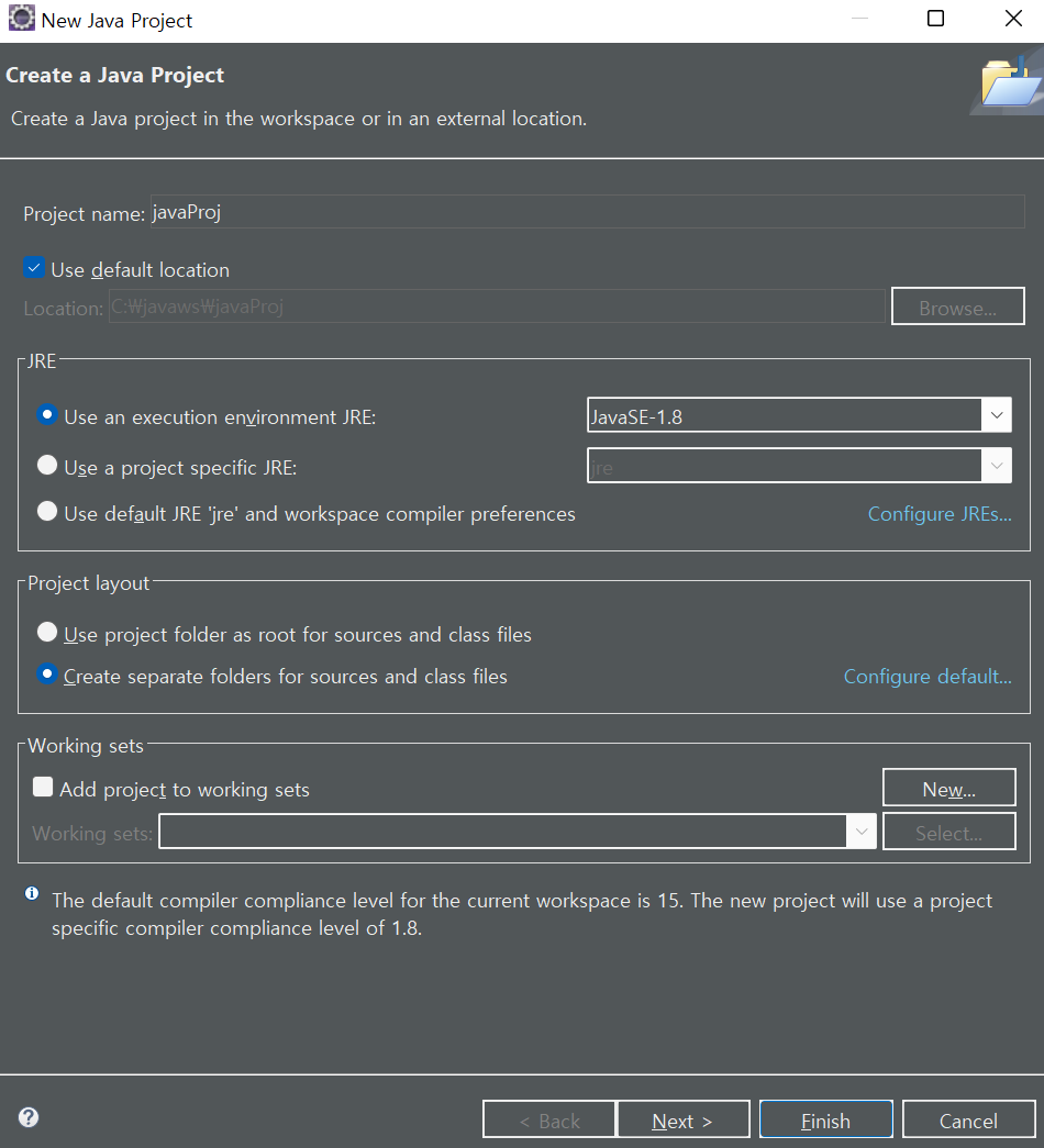 메뉴바에서 file - new - java project 클릭
